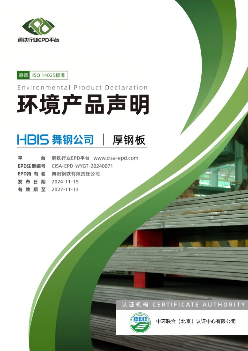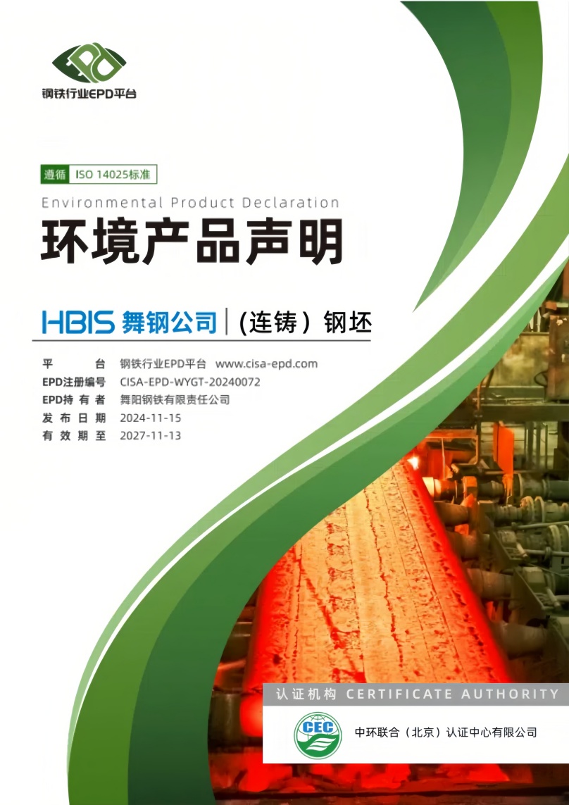 2024年11月15日,經中環聯合認證中心(以下簡稱“中環聯合”)驗證的舞陽鋼鐵有限責任公司鋼鐵產品環境產品聲明(EPD)在中國鋼鐵工業協會EPD平臺上成功發布。該項目也是中環聯合完成的首個項目。