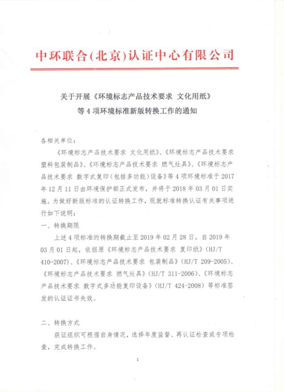 關于《環境標志產品技術要求+文化用紙》等4項國家環境保護標準轉換的通知)