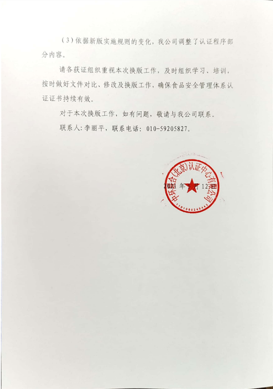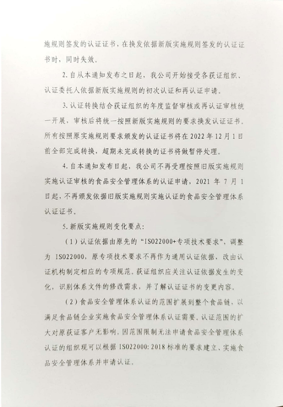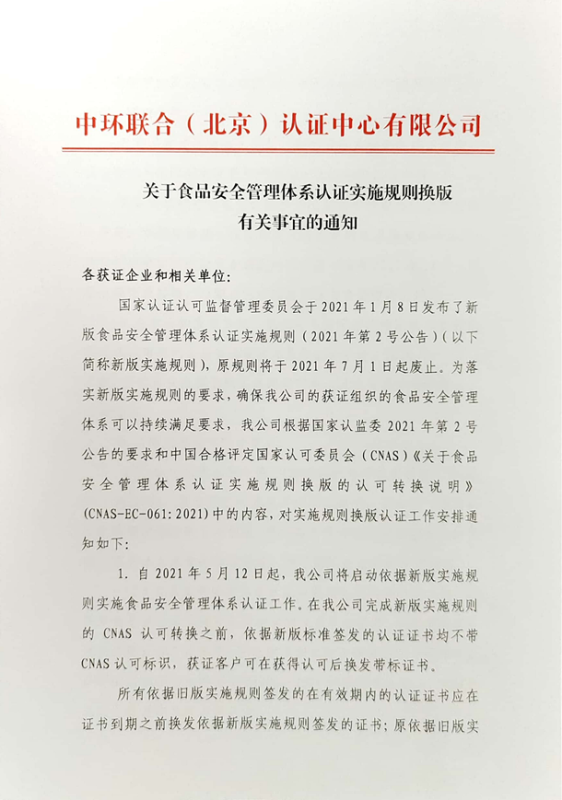 關于食品安全管理體系認證實施規則換版有關事宜的通知