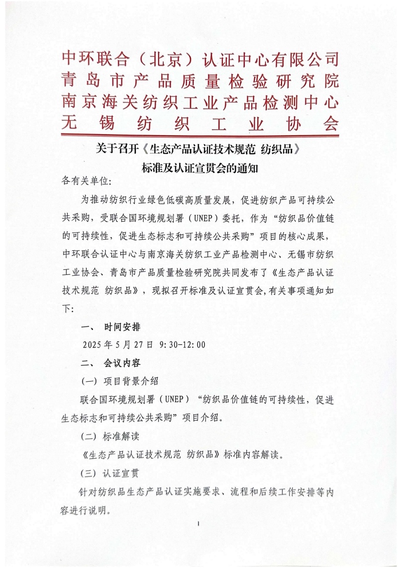 關于召開《生態產品認證技術規范 紡織品》標準及認證宣貫會的通知